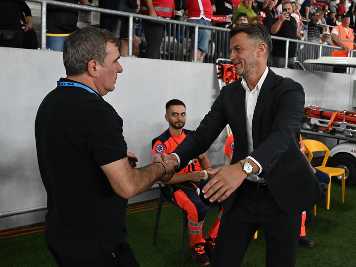 Descriere: Cei doi antrenori Gheorghe Hagi si Ovidiu Nicusor Burca se saluta inaintea meciului de fotbal dintre Dinamo Bucuresti si Farul Constanta, din cadrul Superligii Superbet, desfasurat pe Stadionul National Arcul de Triumf din Bucuresti, vineri 22 septembrie 2023. © FOTO:Razvan Pasarica/SPORT PICTURES
