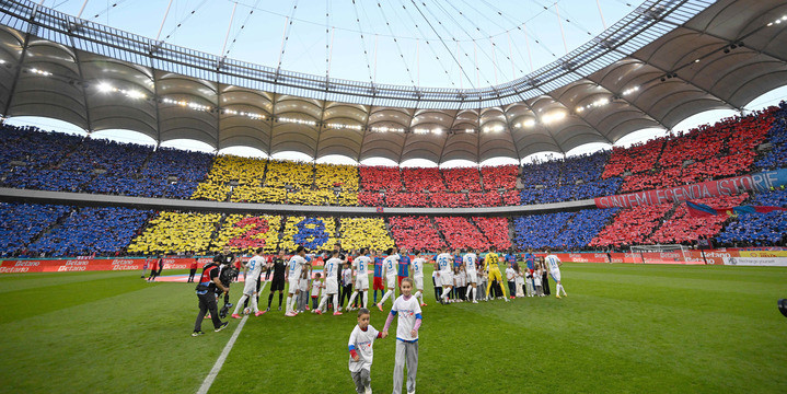 Descriere: Fotbalistii celor doua echipe, alături de coregrafie tribunelor, se saluta inaintea meciului de fotbal dintre FCSB si Universitatea Craiova, din cadrul Play off-ului Superligii Superbet, desfasurat pe Arena Nationala din Bucuresti, sambata 17 mai 2025. © FOTO:Razvan Pasarica/SPORT PICTURES