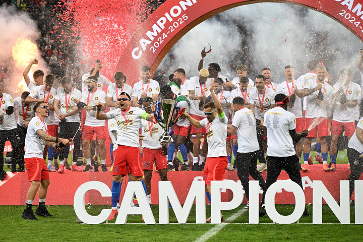 Descriere: Fotbalistii ros-albastrii celebreaza castigarea Superligii Superbet in urma meciului dintre FCSB si Universitatea Craiova, din cadrul Play off-ului competitiei, desfasurat pe Arena Nationala din Bucuresti, sambata 17 mai 2025. © FOTO:Razvan Pasarica/SPORT PICTURES