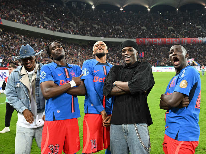 Descriere: Fotbaliștii ros-albastrii Siyabonga Ngezana, Jordan Youri Gele, Malcolm Sylas Laouari Edjouma, Joyskim Aurelien Dawa Tchakonte si Baba Alhassan se bucura dupa meciul de fotbal dintre FCSB si Universitatea Craiova, din cadrul Play off-ului Superligii Superbet, desfasurat pe Arena Nationala din Bucuresti, sambata 17 mai 2025. © FOTO:Razvan Pasarica/SPORT PICTURES