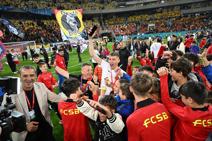 Descriere: Octavian George Popescu celebreaza alături de copii de mingi castigarea Superligii Superbet in urma meciului dintre FCSB si Universitatea Craiova, din cadrul Play off-ului competitiei, desfasurat pe Arena Nationala din Bucuresti, sambata 17 mai 2025. © FOTO:Razvan Pasarica/SPORT PICTURES
