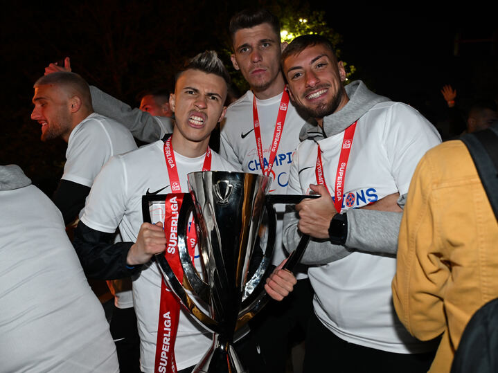 Descriere: Fotbalistii ros-albastrii Octavian George Popescu, Ștefan Târnovanu si Mihai Daniel Lixandru celebreaza castigarea Superligii Superbet intr-un autocar descoperit pe traseul Arena Nationala-Parcul Herastrau din Bucuresti, sambata 17 mai 2025. © FOTO:Razvan Pasarica/SPORT PICTURES