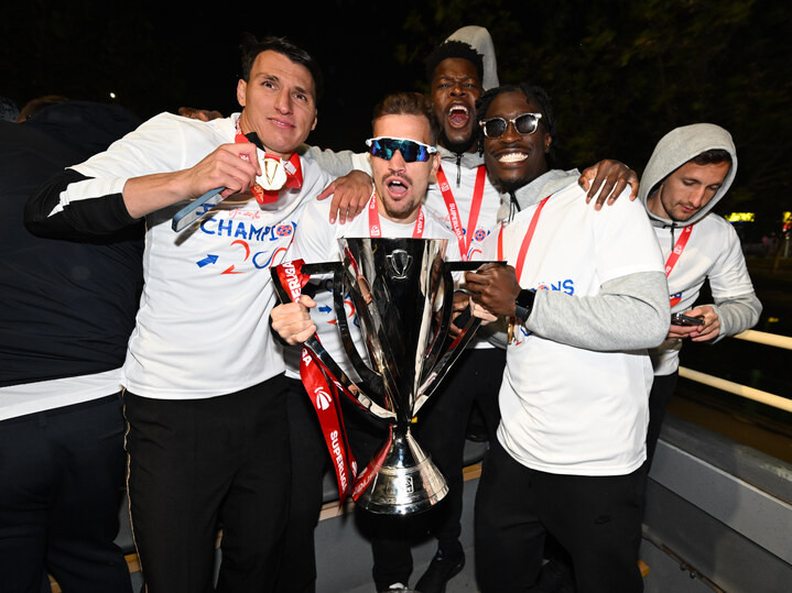 Descriere: Fotbalistii ros-albastrii Risto Radunovic, Darius Dumitru Olaru, Enagnon David Kiki si Jordan Youri Gele celebreaza castigarea Superligii Superbet intr-un autocar descoperit pe traseul Arena Nationala-Parcul Herastrau din Bucuresti, sambata 17 mai 2025. © FOTO:Razvan Pasarica/SPORT PICTURES