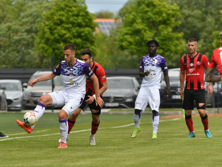 Descriere: Eldin Memedovic, Emmanuel Mensah si Márk Kovács, Attila Csürös in meciul de fotbal dintre AFK Csikszereda Miercurea Ciuc si ACSC FC Arges, contand pentru Liga 2 Casa Pariurilor Play-Off Promovare, desfasurat pe Stadionul Municipal din Miercurea Ciuc, duminica 18 mai 2025. © FOTO: Bogdan Balas/SPORT PICTURES
