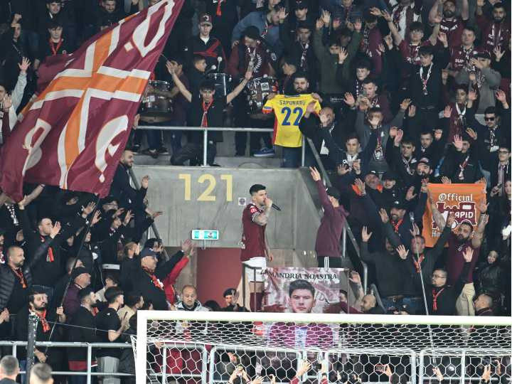 Descriere: Cristian Ionuț Săpunaru canta alături de galerie la meciul de fotbal dintre Rapid Bucuresti si CFR Cluj, din cadrul Play off-ului Superligii Superbet, desfasurat pe Superbet Arena Giulesti din Bucuresti, luni 19 mai 2025. © FOTO:Razvan Pasarica/SPORT PICTURES