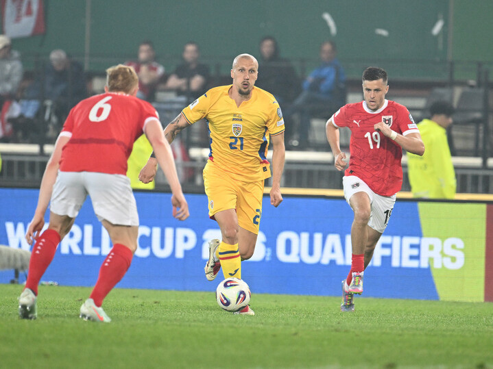 Descriere: Vlad Chiriches si Christoph Baumgartner in meciul de fotbal dintre Austria si Romania, din cadrul Preliminariilor Campionatului Mondial 2026, desfasurat pe Stadionul Ernst Happel din Viena, sambata 7 iunie 2025. © FOTO:Razvan Pasarica/SPORT PICTURES
