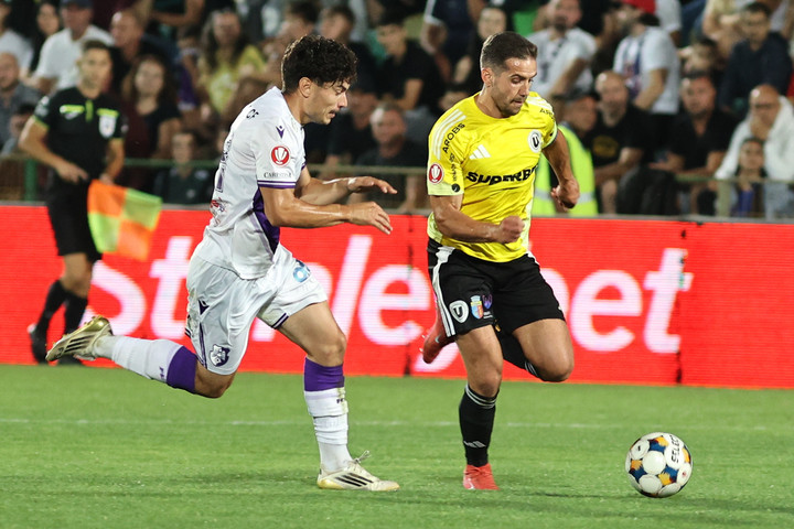Descriere: Mihaita Alexandru Chipciu si Jakov Blagaic in meciul de fotbal dintre FC Arges si FC Universitatea Cluj, contand pentru Superliga Superbet, desfasurat pe Stadionul Orasenesc din Mioveni, sambata 19 septembrie 2025. © FOTO:Gheorghe Fluster/SPORT PICTURES