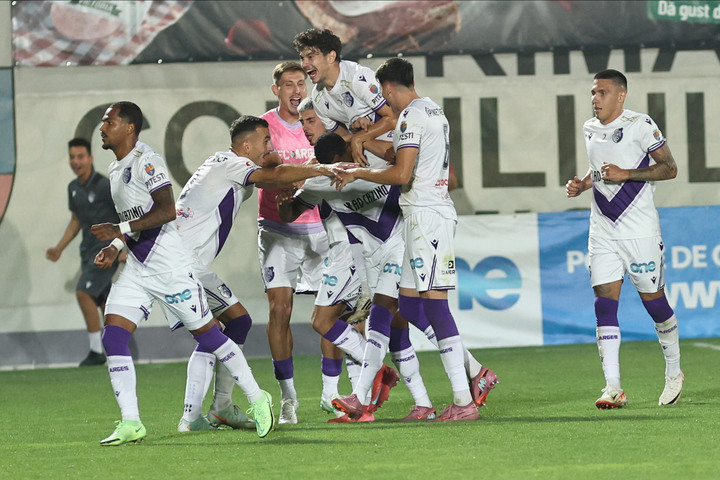 Descriere: Fotbalistii argeseni se bucura dupa un gol marcat in meciul de fotbal dintre FC Arges si FC Universitatea Cluj, contand pentru Superliga Superbet, desfasurat pe Stadionul Orasenesc din Mioveni, sambata 19 septembrie 2025. © FOTO:Gheorghe Fluster/SPORT PICTURES
