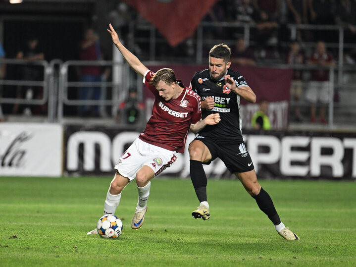 Descriere: Tobias Christensen si Sergiu Florin Bus in meciul de fotbal dintre Rapid Bucuresti si FC Hermannstadt, din cadrul Superligii Superbet, desfasurat pe Superbet Arena-Giulesti din Bucuresti, duminica 21 septembrie 2025. © FOTO:Razvan Pasarica/SPORT PICTURES