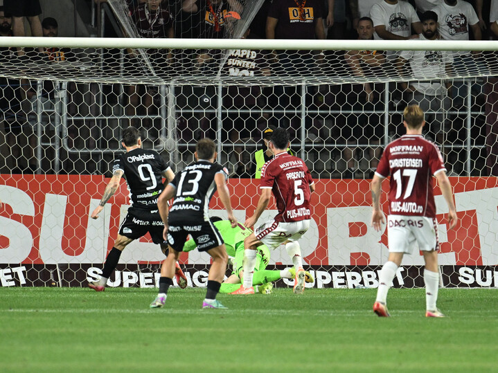 Descriere: Aurelian Ionut Chitu marchează un gol în poarta lui Marian Mihai Aioani in meciul de fotbal dintre Rapid Bucuresti si FC Hermannstadt, din cadrul Superligii Superbet, desfasurat pe Superbet Arena-Giulesti din Bucuresti, duminica 21 septembrie 2025. © FOTO:Razvan Pasarica/SPORT PICTURES