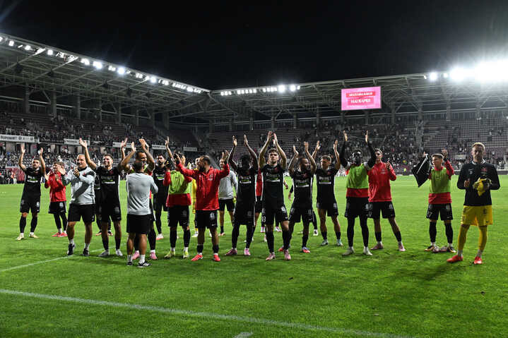 Descriere: Fotbalistii sibieni Sergiu Florin Bus, Antoni Valeri Ivanov, Ciprian Ionut Biceanu, Tiberiu Ionut Capusa, Florin Bejan, Luca Gabriel Stancu, Cristian Daniel Negut, Nana Kwame Antwi, Kevin Andrei Ciubotaru, Silva Jair Tavares, Constantin Dragos Albu, Kalifa Kujabi, Ioan Barstan si Vlad Ionut Mutiu saluta galeria dupa meciul de fotbal dintre Rapid Bucuresti si FC Hermannstadt, din cadrul Superligii Superbet, desfasurat pe Superbet Arena-Giulesti din Bucuresti, duminica 21 septembrie 2025. © FOTO:Razvan Pasarica/SPORT PICTURES