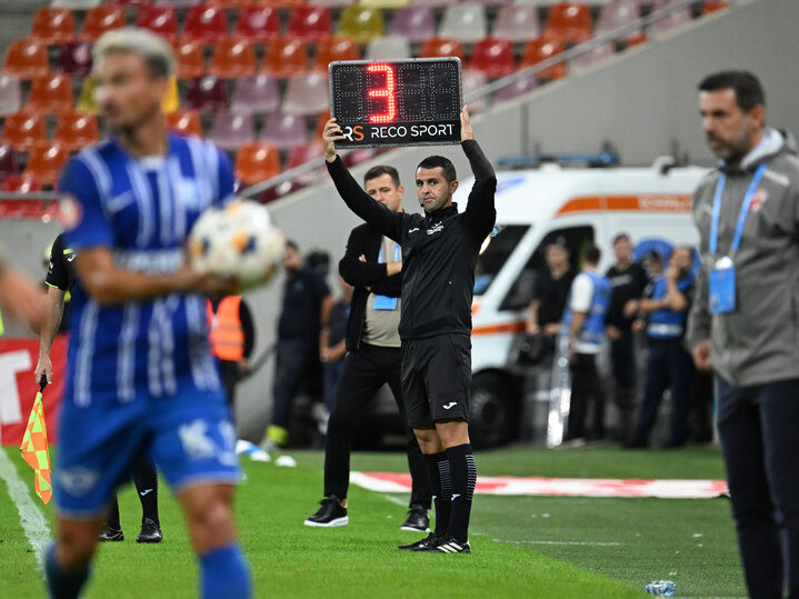 Descriere: Arbitrul de rezerva Iulian Calin indica minutele aditionale ale primei reprize din meciul de fotbal dintre Dinamo Bucuresti si Farul Constanta, din cadrul Superligii Superbet, desfasurat pe Arena Nationala din Bucuresti, luni 22 septembrie 2025. © FOTO:Razvan Pasarica/SPORT PICTURES