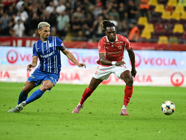 Descriere: Cristian George Ganea si Mamoudou Karamoko in meciul de fotbal dintre Dinamo Bucuresti si Farul Constanta, din cadrul Superligii Superbet, desfasurat pe Arena Nationala din Bucuresti, luni 22 septembrie 2025. © FOTO:Razvan Pasarica/SPORT PICTURES