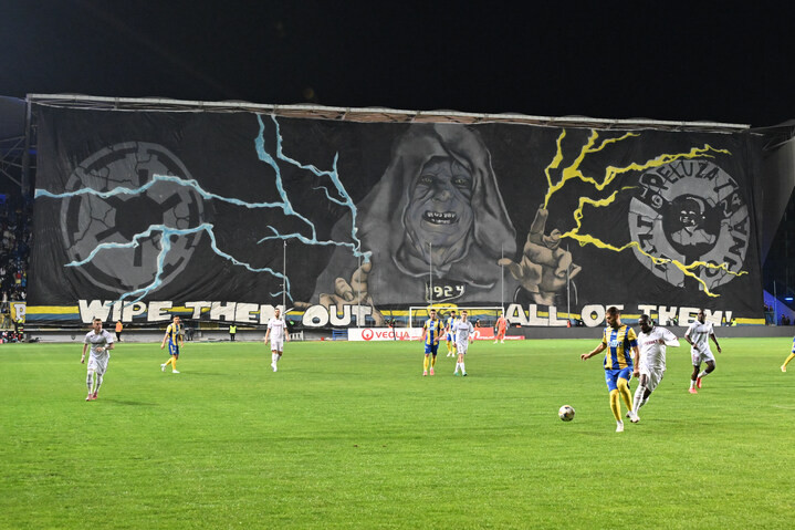 Descriere: Coregrafie petrolista cu trimitere la celebrul film Star Wars prezentata in peluza la meciul dintre Petrolul Ploiesti si Rapid Bucuresti, contand pentru Superliga Superbet, desfasurat pe Stadionul Ilie Oana din Ploiesti, sambata 27 septembrie 2025. © FOTO:Razvan Pasarica/SPORT PICTURES