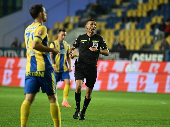 Descriere: Arbitrul central Marcel Birsan reacționează in meciul dintre Petrolul Ploiesti si Rapid Bucuresti, contand pentru Superliga Superbet, desfasurat pe Stadionul Ilie Oana din Ploiesti, sambata 27 septembrie 2025. © FOTO:Razvan Pasarica/SPORT PICTURES