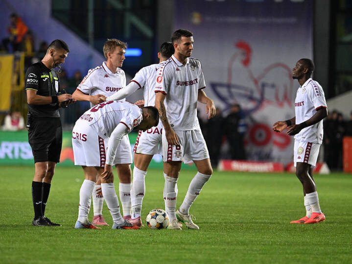 Descriere: Arbitrul central Marcel Birsan alături de fotbalistii rapidisti Catalin Alin Vulturar, Luka Gojkovic si Lars Kramer in meciul dintre Petrolul Ploiesti si Rapid Bucuresti, contand pentru Superliga Superbet, desfasurat pe Stadionul Ilie Oana din Ploiesti, sambata 27 septembrie 2025. © FOTO:Razvan Pasarica/SPORT PICTURES
