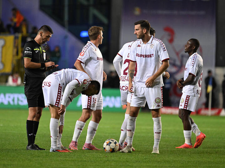 Descriere: Arbitrul central Marcel Birsan alături de fotbalistii rapidisti Catalin Alin Vulturar, Luka Gojkovic si Lars Kramer in meciul dintre Petrolul Ploiesti si Rapid Bucuresti, contand pentru Superliga Superbet, desfasurat pe Stadionul Ilie Oana din Ploiesti, sambata 27 septembrie 2025. © FOTO:Razvan Pasarica/SPORT PICTURES