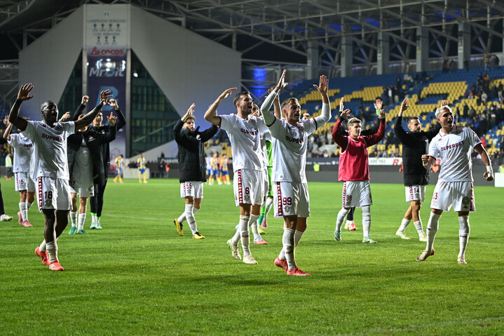 Descriere: Fotbalistii rapidisti Rares Mihai Pop, Abdul Kader Keita, Lars Kramer, Claudiu Valentin Micovschi, Gabriel Gheorghe, Jakub Hromada, Cristian Marian Manea si Luka Gojkovic saluta galeria dupa meciul dintre Petrolul Ploiesti si Rapid Bucuresti, contand pentru Superliga Superbet, desfasurat pe Stadionul Ilie Oana din Ploiesti, sambata 27 septembrie 2025. © FOTO:Razvan Pasarica/SPORT PICTURES