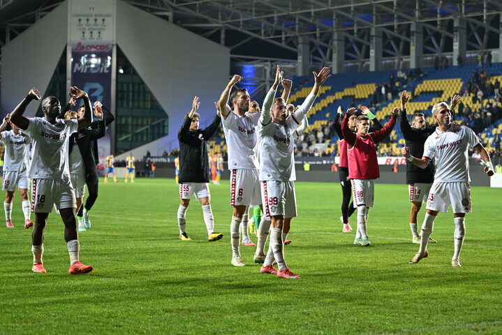 Descriere: Fotbalistii rapidisti Rares Mihai Pop, Abdul Kader Keita, Lars Kramer, Claudiu Valentin Micovschi, Gabriel Gheorghe, Jakub Hromada, Cristian Marian Manea si Luka Gojkovic saluta galeria dupa meciul dintre Petrolul Ploiesti si Rapid Bucuresti, contand pentru Superliga Superbet, desfasurat pe Stadionul Ilie Oana din Ploiesti, sambata 27 septembrie 2025. © FOTO:Razvan Pasarica/SPORT PICTURES