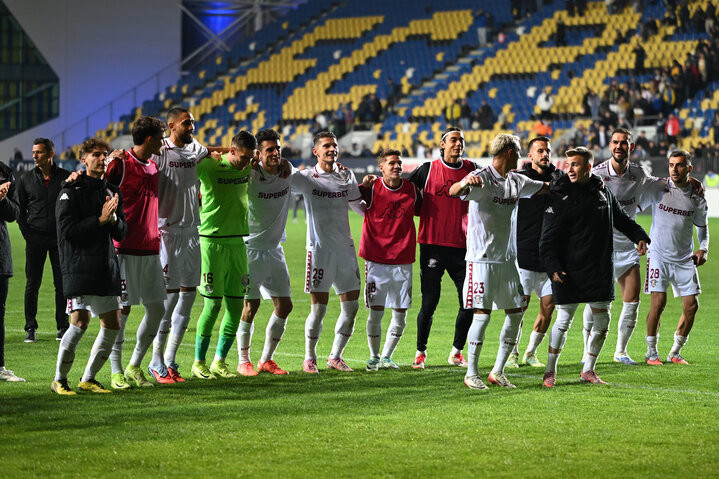 Descriere: Fotbalistii rapidisti Rares Mihai Pop, Leonardo Da Costa Bolgado, Marian Mihai Aioani, Alexandru Stefan Pascanu, Mihai Alexandru Dobre, Gabriel Gheorghe, Cristian Marian Manea, Claudiu Adrian Mihai Petrila, Elvir Koljic si Luka Gojkovic saluta galeria dupa meciul dintre Petrolul Ploiesti si Rapid Bucuresti, contand pentru Superliga Superbet, desfasurat pe Stadionul Ilie Oana din Ploiesti, sambata 27 septembrie 2025. © FOTO:Razvan Pasarica/SPORT PICTURES