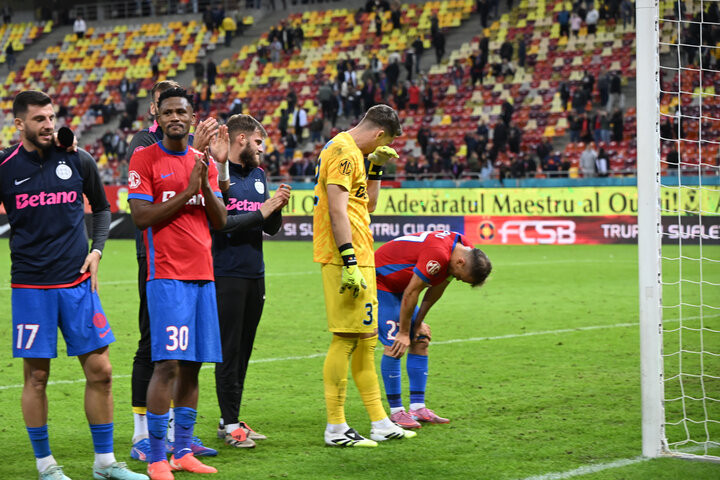 Descriere: Fotbalistii ros-albastrii Mihai Popescu, Siyabonga Ngezana, Mihai Răzvan Udrea, Ștefan Târnovanu si Darius Dumitru Olaru saluta galeria dupa meciul dintre FCSB si Otelul Galati, contand pentru Superliga Superbet, desfasurat pe Arena Nationala din Bucuresti, duminica 28 septembrie 2025. © FOTO:Razvan Pasarica/SPORT PICTURES
