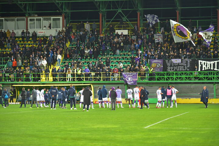 Descriere: Fotbalistii argeseni saluta galeria dupa meciul de fotbal dintre FC Arges si FC Petrolul Ploiesti, contand pentru Superliga Superbet, desfasurat pe Stadionul Orasenesc din Mioveni,sambata 4 octombrie 2025. © FOTO:Mihai Nitoiu/SPORT PICTURES