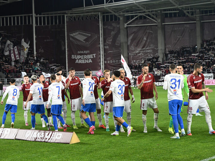 Descriere: Fotbalistii celor doua echipe se saluta inaintea meciului de fotbal dintre Rapid Bucuresti si Farul Constanta, din cadrul Superligii Superbet, desfasurat pe Superbet Arena-Giulesti din Bucuresti, sambata 4 octombrie 2025. © FOTO:Razvan Pasarica/SPORT PICTURES