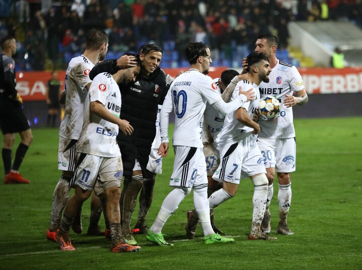 Descriere: Fotbalistii botoseneni se bucura dupa un gol marcat in meciul de fotbal dintre FC Botosani si UTA Arad, contand pentru Superliga Superbet, desfasurat pe Stadionul Municipal din Botosani, luni 6 octombrie 2025. © FOTO:Ionut Tabultoc/SPORT PICTURES