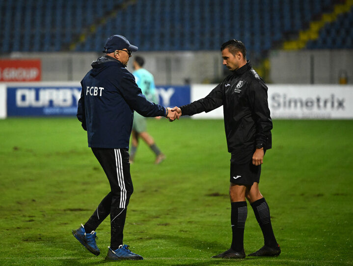 Descriere: Leo Grozavu il saluta pe arbitrul de rezerva Vlad Baban dupa meciul de fotbal dintre FC Botosani si UTA Arad, contand pentru Superliga Superbet, desfasurat pe Stadionul Municipal din Botosani, luni 6 octombrie 2025. © FOTO:Tudy/SPORT PICTURES