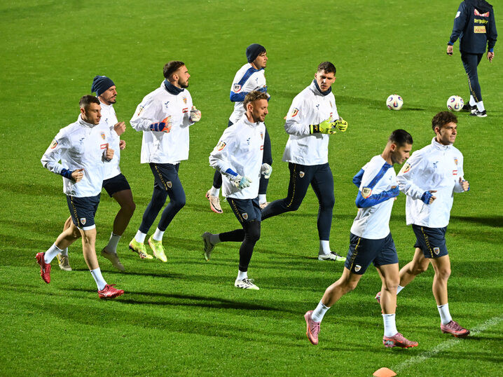 Descriere: Fotbalistii romani Bogdan Racovitan, Andrei Burca, Razvan Sava, Andrei Rațiu, Ionut Radu, Ştefan Târnovanu, Alexandru Dobre si Kevin Ciubotaru la antrenamentul oficial de dinaintea meciului amical impotriva Moldovei, desfasurat la Centrul National de Fotbal de la Mogosoaia, miercuri 8 octombrie 2025. © FOTO:Razvan Pasarica/SPORT PICTURES