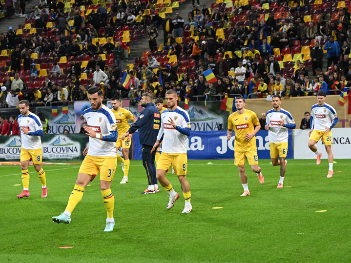 Descriere: Fotbalistii romani Alexandru Mihaita Chipciu, Mihai Popescu, Andrei Burca, Andrei Rațiu, Daniel Birligea, Valentin Mihaila, Marius Marin si Dennis Man la incalzire inaintea meciului de fotbal dintre Romania si Austria, din cadrul Preliminariilor Campionatului Mondial 2026, desfasurat pe Arena Nationala din Bucuresti, duminica 12 octombrie 2025. © FOTO:Razvan Pasarica/SPORT PICTURES