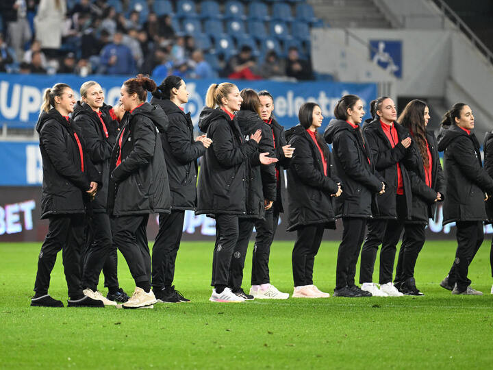Descriere: Handbalistele Romaniei prezentate publicului la pauza meciului dintre Universitatea Craiova si Unirea Slobozia, contand pentru Superliga Superbet, desfasurat pe Stadionul Ion Oblemenco din Craiova, sambata 18 octombrie 2025. © FOTO:Razvan Pasarica/SPORT PICTURES