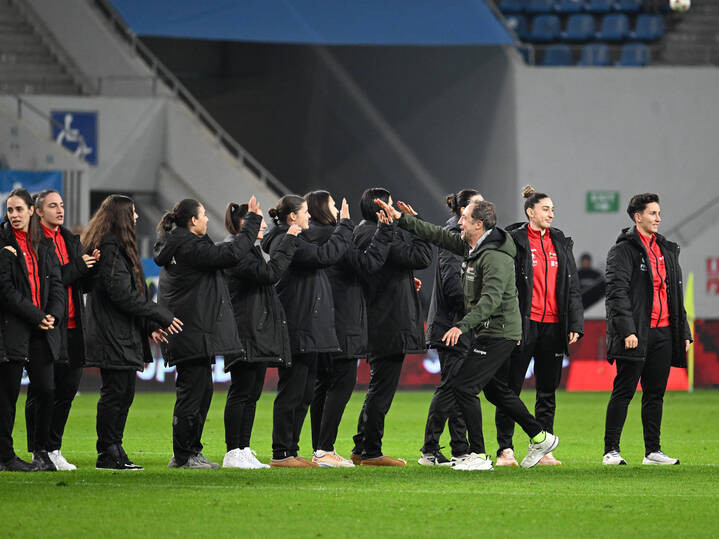 Descriere: Handbalistele Romaniei, aici alături de antrenorul lor Ovidiu Mihaila, prezentate publicului la pauza meciului dintre Universitatea Craiova si Unirea Slobozia, contand pentru Superliga Superbet, desfasurat pe Stadionul Ion Oblemenco din Craiova, sambata 18 octombrie 2025. © FOTO:Razvan Pasarica/SPORT PICTURES