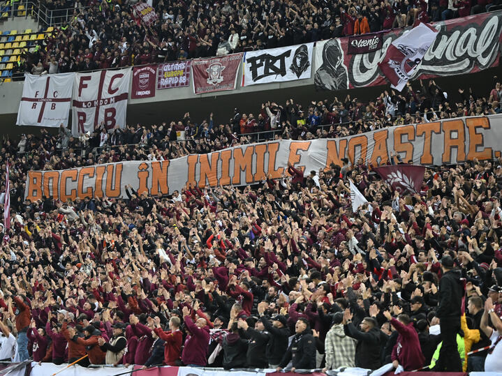 Descriere: Mesaj al galeriei rapidiste pentru liderul lor Bocciu, alias Liviu Ungurean afisat in peluza la meciul de fotbal dintre Dinamo Bucuresti si Rapid Bucuresti, din cadrul Superligii Superbet, desfasurat pe Arena Nationala din Bucuresti, duminica 19 octombrie 2025. © FOTO:Razvan Pasarica/SPORT PICTURES