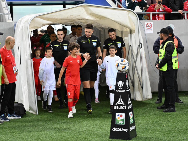 Descriere: Brigada de arbitri formată din Mihai Marius Marica, Marian Barbu si George Florin Neacsu la startul meciului de fotbal dintre Dinamo Bucuresti si Rapid Bucuresti, din cadrul Superligii Superbet, desfasurat pe Arena Nationala din Bucuresti, duminica 19 octombrie 2025. © FOTO:Razvan Pasarica/SPORT PICTURES