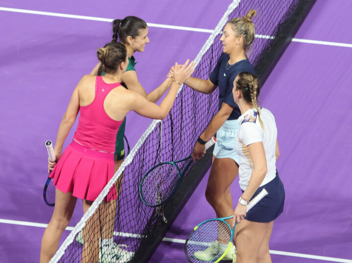 Descriere: Jucatoarele se saluta dupa meciul de tenis dintre Jaqueline Cristian/Angelica Moratelli (Romania/Italia) si Irina Camelia Begu/Sorana Cirstea (Romania/Romania) din cadrul turneului Transilvania Open 2025 WTA 250, desfasurat la BT Arena Cluj din Cluj-Napoca, vineri 7 februarie 2025. © FOTO: Marian Valentin Burlacu/SPORT PICTURES