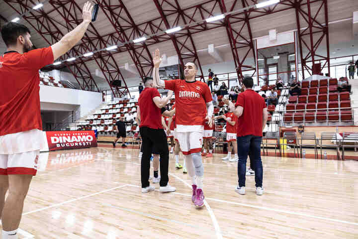 Descriere: Baschetbalistii dinamovistii se incurajeaza la startul meciului de baschet dintre CS Dinamo Bucuresti și CSA Steaua Bucuresti, din cadrul Ligii Nationale de Baschet Masculin GETICA 95, desfasurat in Sala Dinamo din Bucuresti, joi 1 mai 2025. © FOTO: Mihai Neacsu/SPORT PICTURES