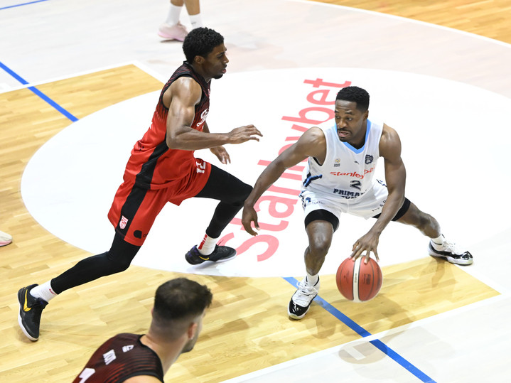 Descriere: Marcus Andthony Lewis si Giordan Lee Watson in meciul de baschet masculin dintre CSO Voluntari si Dinamo Bucuresti, contand pentru Liga Nationala Getica 95, desfasurat in Sala Gabriela Szabo din Voluntari, miercuri 1 octombrie 2025. © FOTO:Razvan Pasarica/SPORT PICTURES