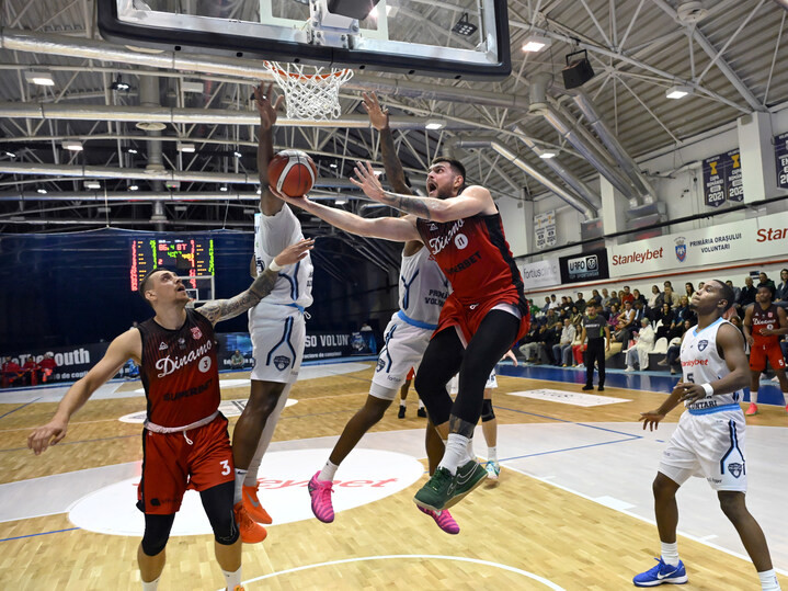 Descriere: Vyacheslav Bobrov, Stefan Iulian Grasu si Michael Anthony Caffey in meciul de baschet masculin dintre CSO Voluntari si Dinamo Bucuresti, contand pentru Liga Nationala Getica 95, desfasurat in Sala Gabriela Szabo din Voluntari, miercuri 1 octombrie 2025. © FOTO:Razvan Pasarica/SPORT PICTURES