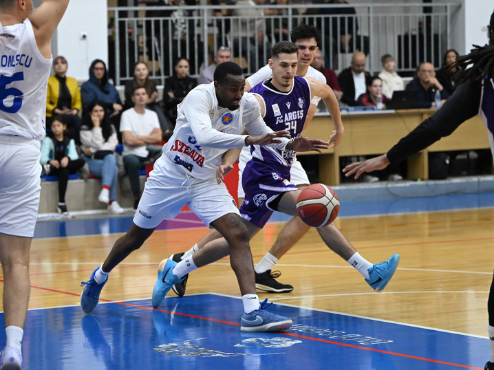 Descriere: Demilade Ebose Adeyemi Adelekun si Matei Alexandru Dorneanu in meciul de baschet masculin dintre Steaua Sharks Bucuresti si FC Arges Pitesti, din cadrul Ligii Nationale Getica 95, desfasurat in Sala Regimentului de garda Mihai Viteazul din Bucuresti, sambata 4 octombrie 2025. © FOTO:Razvan Pasarica/SPORT PICTURES