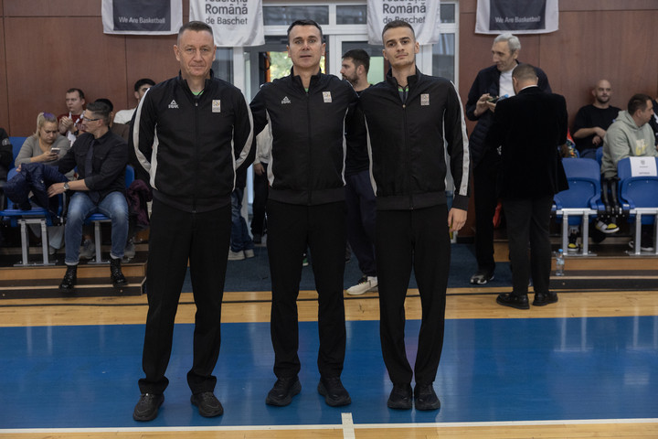 Descriere: Brigada de arbitri alcatuita din Arbitrul Marius Ciulin, Arbitrul Laszlo Bukuresti si Arbitrul Victor Gubernu la startul meciului de baschet dintre CS Dinamo Bucuresti și CS Rapid Bucuresti, din cadrul Ligii Nationale de Baschet Masculin GETICA 95, desfasurat la Arena de Baschet Bucuresti, sambata 11 octombrie 2025. © FOTO:Mihai Neacsu/SPORT PICTURES