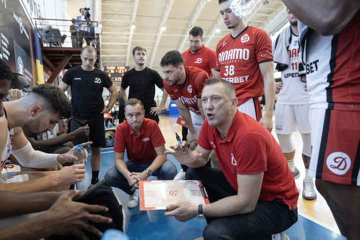 Descriere: Zydrunas Urbonas dand indicatii la un time-out in meciul de baschet dintre CS Dinamo Bucuresti și CS Rapid Bucuresti, din cadrul Ligii Nationale de Baschet Masculin GETICA 95, desfasurat la Arena de Baschet Bucuresti, sambata 11 octombrie 2025. © FOTO:Mihai Neacsu/SPORT PICTURES