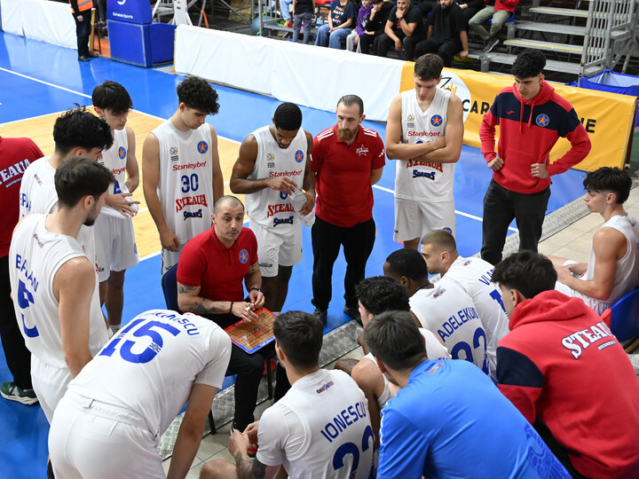 Descriere: Baschetbalistii stelisti printre care Albert Mark Stan, Andrei Alexandru Matei si George Alexandru Vlad la un timeout alaturi de antrenorul lor Andrei Rares Mandache in meciul de baschet masculin dintre Steaua Sharks Bucuresti si SCMU Craiova, din cadrul Ligii Nationale Getica 95, desfasurat in Sala Regimentului de garda Mihai Viteazul din Bucuresti, sambata 11 octombrie 2025. © FOTO:Razvan Pasarica/SPORT PICTURES