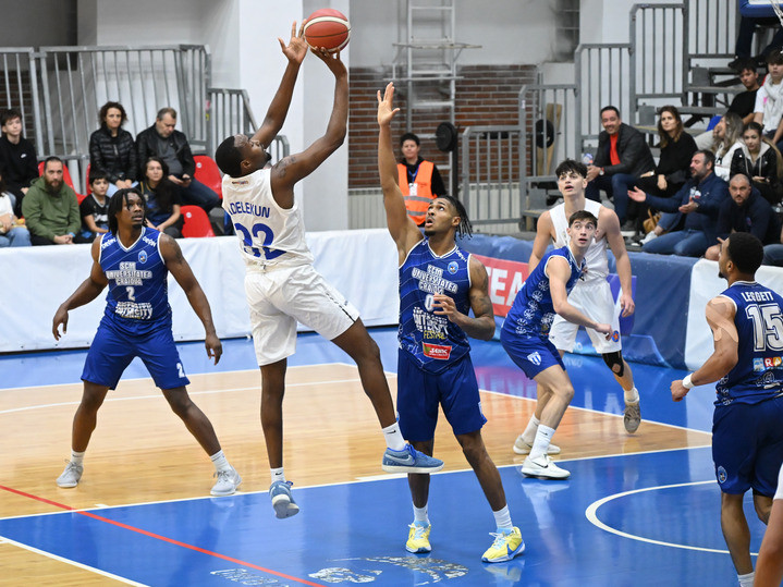 Descriere: De Andre Ramon Dishman, Demilade Ebose Adeyemi Adelekun si Kendall Tyrek Robinson in meciul de baschet masculin dintre Steaua Sharks Bucuresti si SCMU Craiova, din cadrul Ligii Nationale Getica 95, desfasurat in Sala Regimentului de garda Mihai Viteazul din Bucuresti, sambata 11 octombrie 2025. © FOTO:Razvan Pasarica/SPORT PICTURES