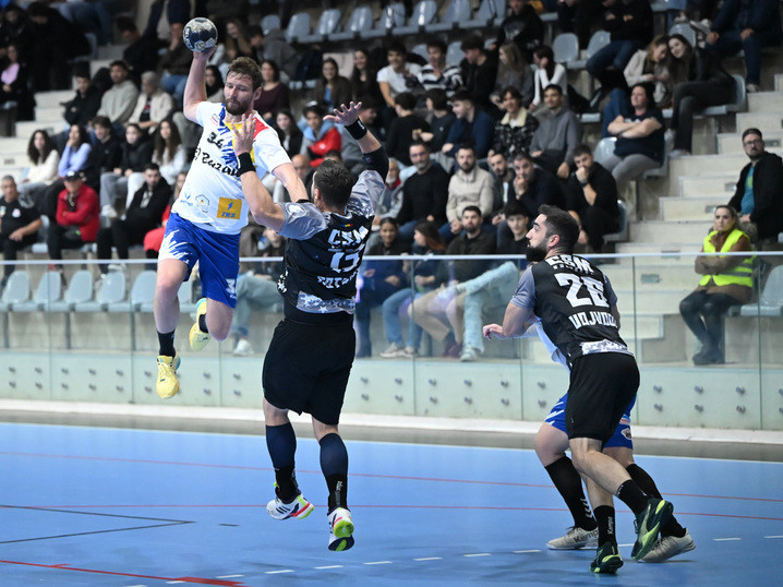 Descriere: Vitaly Komogorov si Janja Vojvodic in meciul de handbal masculin dintre CSM Bucuresti si HC Buzau, contand pentru Liga Zimbrilor, desfasurat in Sala Apollo din Bucuresti, luni 6 octombrie 2025. © FOTO:Razvan Pasarica/SPORT PICTURES