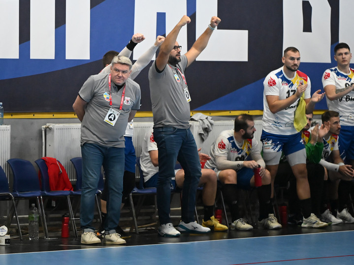 Descriere: Sergey Bebeshko reactioneaza pe banca buzoiana alaturi de Zeljko Sukic si Bogdan Constantin in meciul de handbal masculin dintre CSM Bucuresti si HC Buzau, contand pentru Liga Zimbrilor, desfasurat in Sala Apollo din Bucuresti, luni 6 octombrie 2025. © FOTO:Razvan Pasarica/SPORT PICTURES