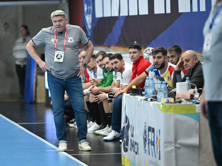 Descriere: Sergey Bebeshko reactioneaza pe banca buzoiana in meciul de handbal masculin dintre CSM Bucuresti si HC Buzau, contand pentru Liga Zimbrilor, desfasurat in Sala Apollo din Bucuresti, luni 6 octombrie 2025. © FOTO:Razvan Pasarica/SPORT PICTURES