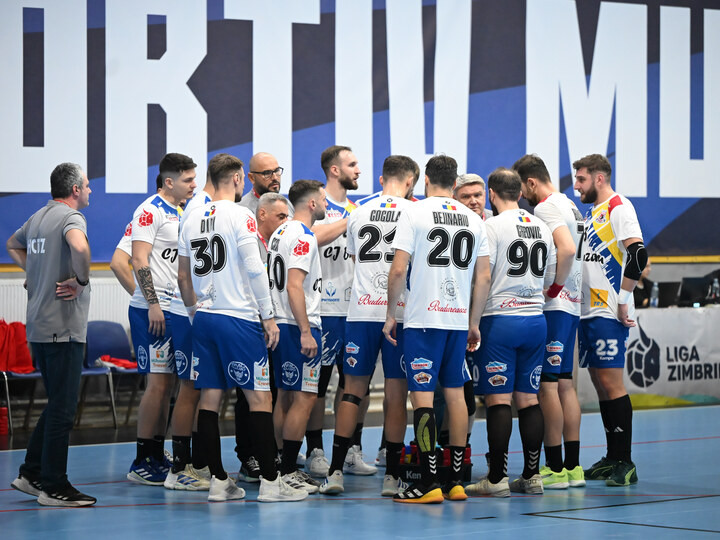 Descriere: Handbalistii buzoieni la un timeout alaturi de antrenorul lor Sergey Bebeshko in meciul de handbal masculin dintre CSM Bucuresti si HC Buzau, contand pentru Liga Zimbrilor, desfasurat in Sala Apollo din Bucuresti, luni 6 octombrie 2025. © FOTO:Razvan Pasarica/SPORT PICTURES