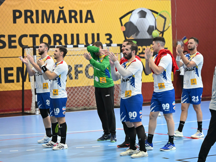Descriere: Handbalistii buzoieni printre care Alexandru Mihai Tarita, Nemanja Grbovic si Lukasz Gogola saluta galeria dupa meciul de handbal masculin dintre CSM Bucuresti si HC Buzau, contand pentru Liga Zimbrilor, desfasurat in Sala Apollo din Bucuresti, luni 6 octombrie 2025. © FOTO:Razvan Pasarica/SPORT PICTURES