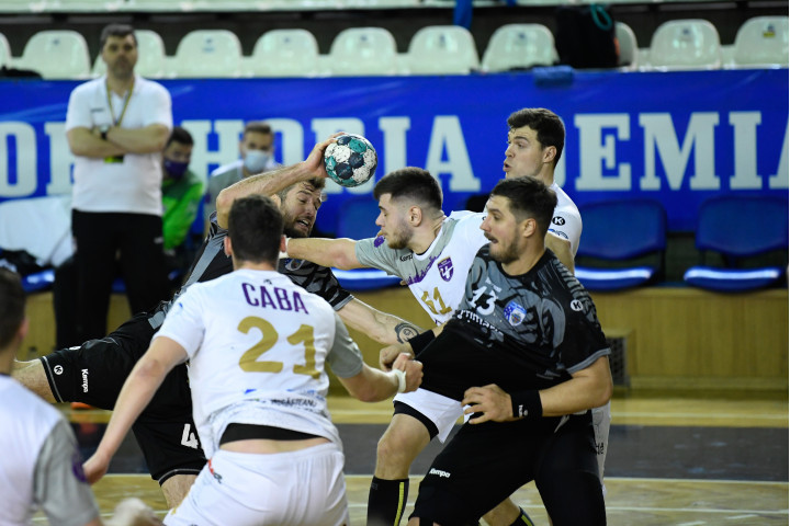 Descriere: Nantes Raul Campos si Adrian Vladut Rotaru in meciul de handbal masculin dintre CSM Bucuresti si SCM Politehnica Timisoara, contand pentru Turneul Liga Zimbrilor, desfasurat fara spectatori in Sala Horia Demian din Cluj Napoca, marti 8 aprilie 2021. © FOTO:Flaviu Buboi/SPORT PICTURES